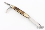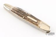 This Slipjoint from Bull Dog Brand Knives features polished blades with nail nicks. The handle has nickel silver bolsters, stag covers over brass liners and stainless steel springs. Has a few light scratches, otherwise excellent condition. Dated 1998. Comes with original box.