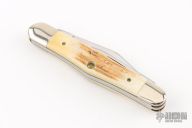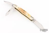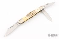 This Swell Center Whittler by Case has 3 mirror polished blades with nail nicks. Nickel silver bolsters, stag scales, brass liners, stainless springs. Has a few very light scratches, excellent condition otherwise. Comes with original box and papers.