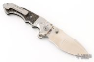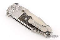 The Javelin folding knife from Andre de Villiers is a masterwork combining functionality and personality. This one has a satin finished blade with thumbhole, notched thumbrest and flipper. It swings smoothly on a ball-bearing system and has both a thumb hole and flipper opener; it can also be opened or closed with a flick of the wrist when the button lock is held down. It has a milled titanium handle in a high satin polish finish with black/gold carbon fiber inlays that offers an extremely comfortable grip. A jimped, black titanium backstrap with a lanyard hole and a tip-up titanium pocket clip with hidden screws. Comes with a zippered case. "61-2021" on the ricasso. Excellent condition.