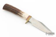 This Model 8-4 by Randall Made Knives features a satin finished blade with sharpened top edge, .154" blade thickness, 1.070" blade depth, hidden tang construction. Especially suitable for small fish and feathered game. Brass guard and stag grip with red/white/blue spacers. Has some oxidation spots on the blade, otherwise good condition.