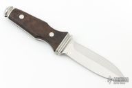 This is a very attractive boot knife from AG Russell. This is the older model made in Solingen, Germany. The mirror polished double edged blade is .155" thick and 1.067" deep at the ricasso and double-edged. Scales are rosewood. Integral construction with aluminum pins. Has some scratches and staining, has been resharpened,  otherwise good condition.