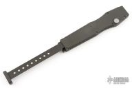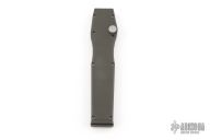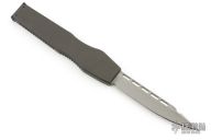 This HALO II is the clip point blade model in the HALO series by Microtech Knives. Single action, side positioned button for firing. Closure via a reverse charging handle in the rear of the frame. Contoured frame grip with milled ribbing on the frame spine and belly. This Halo II has a bead blasted clip point blade dated 9/97. Has some scuffs, otherwise excellent condition for its age.