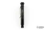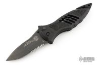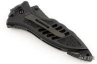 This CQD Mark 1 M/A from Masters of Defense has a spear point black blade with dual thumb studs and serrations. Handle is black aluminum with non-slip inserts, reversible black tip down clip, seat belt cutter, lanyard hole and glass breaker. Comes with original box, nylon sheath, and extra rear razors. Has a couple light scuffs, otherwise excellent condition.