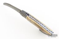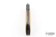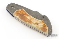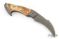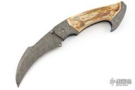 This Rastor by Reese Weiland features a Damascus hawkbill style blade with single thumbstud. The handle has matching Damascus bolsters, anodized liners with jeweled interiors, Mammoth Ivory scales, and a file worked titanium backspacer. Nice detent, lockup and blade seating. Comes with a zippered case. Excellent condition. Marked RW 050 in the backspacer.