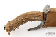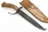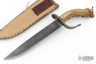 This knife by Master Smith Daniel Winkler features a forged file clip point blade with false top edge, .234" blade stock and 1.399" blade depth, hidden tang construction. The handle has a forged wrought iron guard and crown stag grip with bail in pommel. Comes with a rawhide leather sheath and zipper case. Excellent condition.