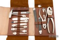 This antique knife set by JA Henckels features a knife with wood handles that can house many different tools included in the kit, including files, and chisels etc. The handle has pinned wood covers, steel liners and spring. Comes with a brown leather pouch. Has some oxidation and patina, otherwise great condition. Very cool piece.