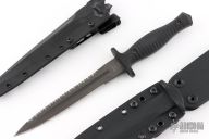 This V-14 Dagger by Spartan Blades is a Les George design, it features a black double edged serrated blade with fuller, .249" blade stock and .900" blade depth. Full tang construction with black G-10 scales. Comes with original sheath and box. Includes extra sheath. Excellent condition.