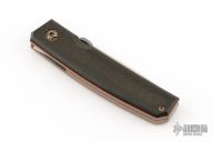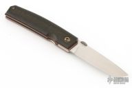 This Tengu TD by Jared Oeser features a hand rub satin finished tanto blade with false top edge and thumb disc style opening. The handle has a bead blasted titanium frame OD Green Westy micarta over orange liners, and multi-color backspacer. Nice detent, lockup and blade seating. Comes with original box, leather pocket sheath and COA dated 8-11-21. Excellent condition.
