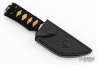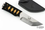 This Tanto from Greg Medford features a satin finished tanto blade with .273" blade stock and 1.35" blade depth, hidden tang construction. The handle has yellow stingray skin under flat black cord wrap. Comes with leather sheath and zipper case. Laser engraved on both sides. Excellent condition.