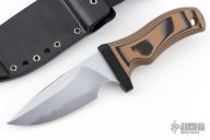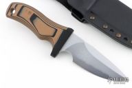 "Outstanding fighter in a compact design. Selectively tempered, the Hell Toad has a Rockwell C-scale hardness of 62 at the edge (as hard as a file), and HRC 50-54 throughout the spine and hidden full tang. Hard chrome blade finish. Sharpened top edge. 1/4" blade thickness and 1.496" blade depth.The ergonomic grip indexes the blade in the user's hand, thus letting the user know how the blade is presented, even in the dark. MDK uses a glass/epoxy composite grip material that is compression bonded to the hidden full tang. With a compressive yield strength of 79,000 psi, the grip can withstand tremendous punishment with no damage. The composite grip material provides 1,000 volts per mil (.001") dielectric strength that electricaly isolates the user from the blade. Our grip material is also impervious to virtually all chemicals and solvents."