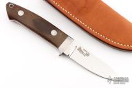 This knife by Jim Merritt is made under the Bob Loveless name, it features a mirror finished blade with the "R.W. Loveless Knives Riverside, Calif." logo. Full tapered tang construction. .179" Blade Stock.  1.017" Blade Depth. Stainless steel guard and green linen micarta scales with red liners.  Lanyard hole. Includes a brown leather sehath.  Excellent Condition.