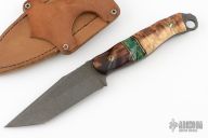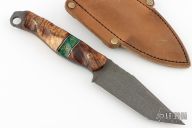 This Crow Jr by Half Face Blades features an acid etch finished tanto style blade with with textured thumbrest, .153" blade stock, 1.257" blade depth, full tang construction. The handle has Hawaiian Curly Koa, Arizona Jade w/ gold web, black liners, and brass mosaic pins. Comes with leather belt sheath. Excellent condition.