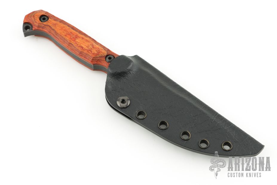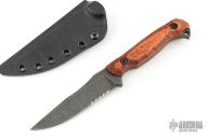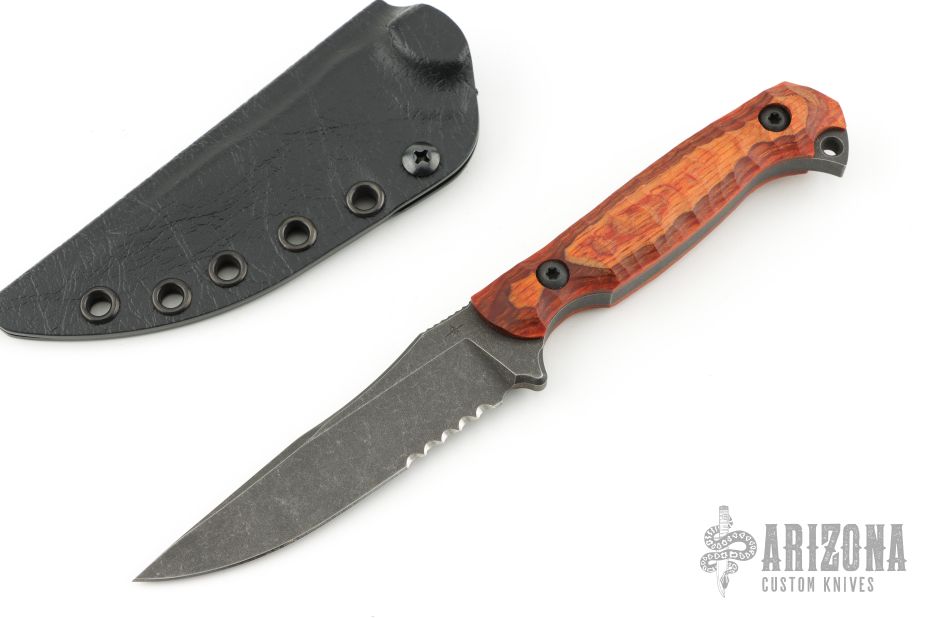 Has serrations and wood grip. Comes with a kydex sheath. Excellent condition.