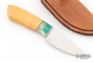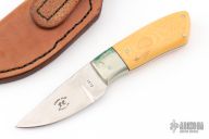This knife by Frank Clay features a mirror polished blade with .134" blade stock and .98" blade depth, full tang construction. The handle nickel silver bolsters with micarta scales. Includes a brown leathers sheath.  Patina is visible on the bolsters otherwise the knife is in excellent condition.