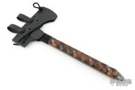 This Hammer Pole Tomahawk by Half Face Blades features 2.25" blade with hammer pole at the rear, .217" blade stock, full tang construction. The handle has Hawaiian Curly Koa wood scales with black liners. Comes with a kydex sheath. Excellent condition.