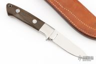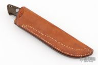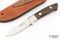 This knife by Jim Merritt is made under the Bob Loveless name, it features a mirror finished blade with the "R.W. Loveless Knives Riverside, Calif." logo.  .151" Blade Stock.  .928" Blade Depth. Full tapered tang construction.  Stainless steel guard and green linen micarta scales with red liners, lanyard hole. Comes with a leather sheath. S/N 128. Has some scuffs and scratches, otherwise the knife is in good condition.