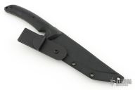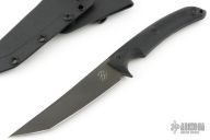 This knife by Bastinelli features a black blade with notched thumbrest with .157" blade stock and 1.138" blade depth, full tang construction. The handle has black G-10 scales. Come with a kydex sheath. Has a couple light sheath scuffs, otherwise excellent condition.
