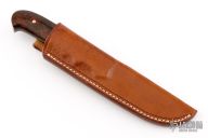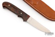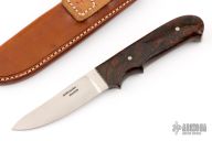 This Hunter by Dietmar Kressler features a hand rub satin finished blade with .129" blade stock and .767" blade depth, full partial tang construction. The handle has rag micarta grip. Includes a brown leather sheath. Excellent Condition.