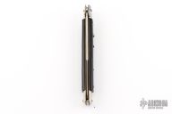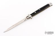 This 13" Swivel Bolster features a bayonet ground blade with false top edge. The handle has stainless steel bolsters, front and rear, black composite scales, brass liners, stainless spring. Has some light scratches and a little blade play, otherwise excellent condition.