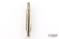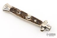 This 15" Swivel Bolster Auto by Falcon features a dagger ground blade with false top edge. The handle has nickel silver bolsters, front and rear, stag scales, D-stamp brass liners, stainless spring. Has some light scratches and a little blade play, otherwise excellent condition.