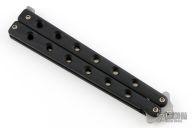 This Tiger Balisong by S.W.A.T. Knives features a satin finished blade with false top edge. The handles are black aluminum with t-latch at the butt. Has a couple light scuffs, otherwise excellent condition.