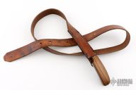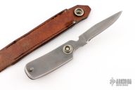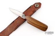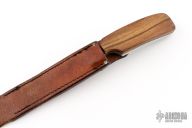 Brown Leather belt with buckle knife by Daniel Valois. Blade slides into concealed leather sheath with button clasp and is curved to follow the contour of the waist. The handle is walnut. Has some scratches and patina on the blade, otherwise excellent condition. 41” belt, 1.25" tall and is a little worn.