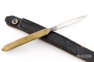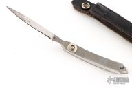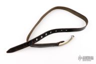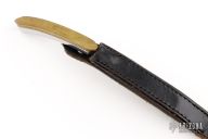 Black Leather belt with buckle knife by Daniel Valois. Blade slides into concealed leather sheath with button clasp and is curved to follow the contour of the waist. The handle is brass. Has some scratches and patina on the blade, otherwise excellent condition. 39” belt, .75" tall and is a little worn.