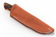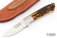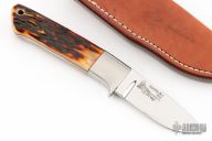 This knife by Bob Loveless. It features a mirror finished blade with the "R.W. Loveless Maker Riverside, Calif." logo.  .118" Blade Stock.  .899" Blade Depth. Full tapered tang construction.  Stainless steel guard and amber stag scales with red liners, lanyard hole. Comes with a leather sheath. Has some scuffs and scratches, otherwise the knife is in excellent condition.