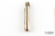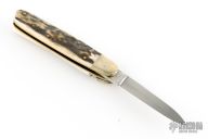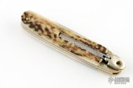 This Lever Lock Automatic by Hubertus Knives features a polished drop point blade. The handle is comprised of nickel silver bolsters and lever with stag scales over brass liners and steel backspacer. Has some light scratches, otherwise excellent condition.
