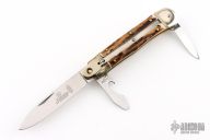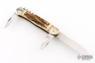 This Stag Multiblade Leverlock by Hubertus has a mirror polished blade, a mirror polished stainless steel clip point blade with nail nick, a mirror polished bottle opener/ flat head screwdriver, cork screw. Scales are stag antler over brass liners, stainless steel back spacer(s), and nickel silver bolsters. Has a few light scratches, otherwise excellent condition.