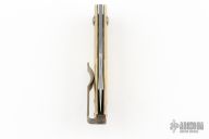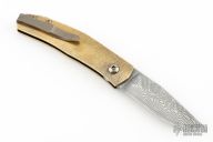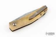 This Casino folder by Jens Anso features a Vinland Damasteel blade with nail nick. The handle has a scratch finished bronze frame, anodized and tumbled titanium tip up clip and backspacer with lanyard hole. Has a double detent mechanism to hold but not "lock" the blade in place. Has a half stop. Perfect blade seating. Comes with COA #182 dated May 2024. Has a couple light scratches on the clip, otherwise Excellent condition.