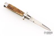 This auto features a spear point blade with a false top edge. Nickle silver guard and rear bolster and stag scales as well as brass liners. Nice function, strong firing. Has some light scratches, otherwise excellent condition.