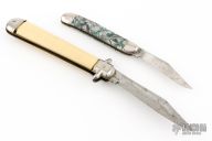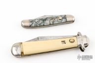 This Colonial Auto by Shur-Snap features a satin finished blade. The handle has steel bolsters and white celluloid scales with steel liners. Has some blade play and light scratches, has shrunken scales, has been resharpened, fair condition for its age.