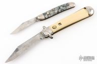 The Hammer Brand auto has a satin finished blade, steel bolsters, acrylic scales, brass liners and steel backspacer. Has scratches and light oxidation, otherwise good condition. 2.625" blade, 6.25" overall, and 3.5" closed.