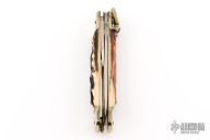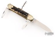 This Stag Multiblade Leverlock by Hubertus has a mirror polished blade, a mirror polished stainless steel clip point blade with nail nick, a mirror polished bottle opener/ flat head screwdriver, cork screw. Scales are stag antler over brass liners, stainless steel back spacer(s), and nickel silver bolsters. Has a few light scratches, otherwise excellent condition.
