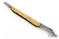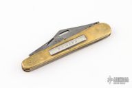 This slipjoint by William Scagel originally had 3 blades, one of them is broken off at the ricasso. The other two blades have nail nick holes. The blades are marked "W. Scagel Handmade" and "USA". The handle has brass covers and a nickel silver escutcheon that is stamped "N.G. DAKE", steel springs and a brass center tapered liner. Has scratches, has been sharpened, has oxidation/pitting, has some dings on the scales, one of the blades is broken off, good condition for its age. Comes with a zippered case.