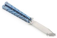 This Venturi Twist Balisong by Darrel Ralph features a hand rub satin finished clip point blade with crowned spine. The handle has nicely contoured and anodized titanium handles with anodized insides, adjustable T-latch at the butt. Darrel's Maxx Glide Pivot Bearing system makes for super smooth flipping. Comes with zippered case. Has some light scratches, otherwise excellent condition.