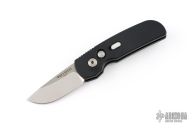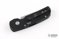 This Calmigo by Pro-tech knives features a satin drop point blade, California Legal. The handle has a black aluminum frame and a matching stainless steel tip up clip, has safety. Has some light scratches on the blade, otherwise good condition. PR3 #185