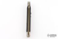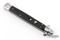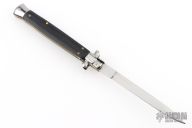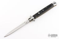 This 13" swivel bolster features a polished dagger ground blade. The handle has stainless steel bolsters, front and rear, blackwood scales, brass liners, stainless spring. Excellent condition. Comes with original box and sheath.