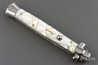 This 13" swivel bolster features a polished dagger ground blade. The handle has stainless steel bolsters, front and rear, pearlex scales, brass liners, stainless spring. Excellent condition. Comes with original box and sheath.