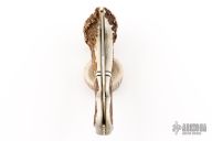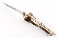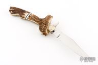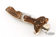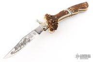 This knife features a mirror polished clip point blade with laser engraving.  The handle has nickel silver bolsters, stag scales, brass liners and a fileworked steel backspring.  The lock is disengaged by using the lever near the front of the knife.  Excellent Condition.