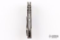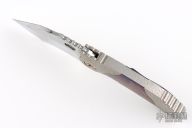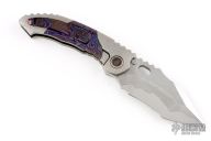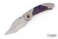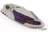 This "Unnamed" integral from Dalibor Bergam features a RWL-34 cored San Mai Damascus with thumbhole and notched thumbrest. The handle is sculpted from a single piece of titanium that has been hand textured, Dark Daltanium scales and tip up clip with hidden screws, Dark Daltanium pivot with zirconium and gold? pivot collars. The blade is centered when closed, opens/closes smoothly, and locks up with absolutely no play. Comes in a zipper case. Excellent condition.