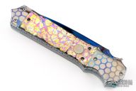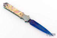 This Hasta side-opening automatic by Brandon Vallotton features a blued San-Mai Damascus blade with false top edge. The handle has super conductor double bolsters, brightly colored scales, matching SC push button. Matching Damascus backstrap, with file work all around the anodized titanium liners. Strong and fast leaf spring action. Nice function. Beautiful materials. Comes with zipper case. Excellent condition.
