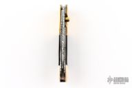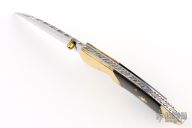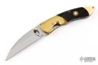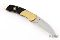 This knife by Cool-Dragon features a mirror polished blade with fileworked spine and a single brass thumbstud. The handle has brass bolsters, buffalo horn and bone scales, fileworked stainless steel liners and backspacer. Nice detent, blade seating and lockup. Has a couple light scratches and patina, otherwise excellent condition.