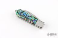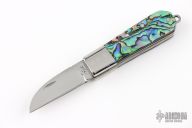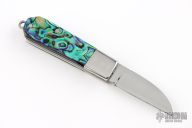 This knife by Cool-Dragon features a mirror polished blade with notched thumbrest and nail nick. The handle has stainless steel bolsters, abalone scales, stainless steel liners and backspacer. Nice blade seating. Has a few light scratches, otherwise excellent condition.