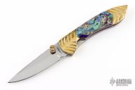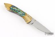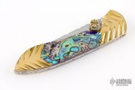 This knife by Cool-Dragon features a mirror polished blade with fileworked spine and a single brass thumbstud. The handle has fileworked brass bolsters, abalone scales, fileworked stainless steel liners and backspacer. Nice detent, blade seating and lockup. Has a few light scratches and patina, otherwise excellent condition.