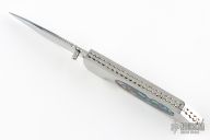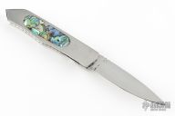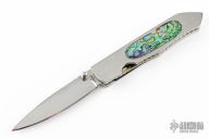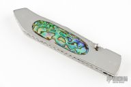 This knife by Cool-Dragon features a mirror polished blade with fileworked spine and a single thumbstud. The handle has fileworked stainless steel scales with abalone inlays, fileworked stainless steel liners and backspacer. Nice detent, blade seating and lockup. Has a few light scratches, otherwise excellent condition.