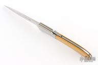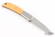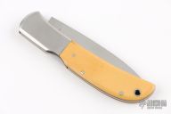 This Eagle lock-back folder from Al Mar features a mirror finished blade with nail nick. The handle has stainless steel bolsters and yellow paper micarta scales over brass liners and stainless steel backspacer. Comes with original brown leather slip sheath. Has a couple of light scratches, otherwise excellent condition.