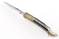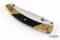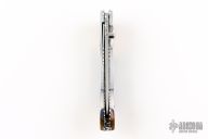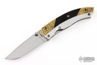This knife by Cool-Dragon features a mirror polished blade with fileworked spine and a single thumbstud. The handle has brass/aluminum/buffalo horn scales, fileworked stainless steel liners and backspacer. Nice detent, blade seating and lockup. Has a few light scratches, otherwise excellent condition.