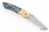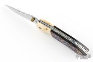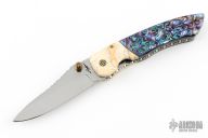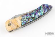 This knife by Cool-Dragon features a mirror polished blade with fileworked spine and a single brass thumbstud. The handle has mammoth tooth bolsters, abalone scales, fileworked stainless steel liners and backspacer. Nice detent, blade seating and lockup. Has a few light scratches, otherwise excellent condition.
